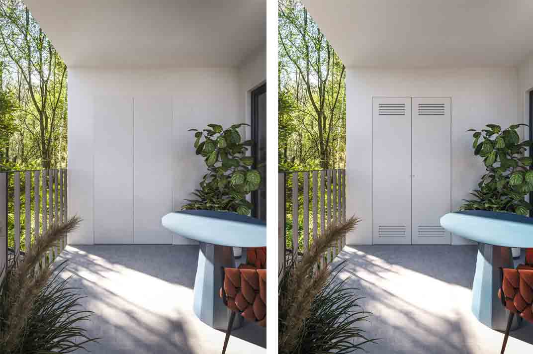 Che si tratti di locali tecnici e caldaia, ripostigli, cucine da esterno o spazi in terrazze, cortili e garage, ECLISSE Syntesis Areo per esterni permette di realizzare sportelli a filo perfettamente integrati, mantenendo la continuità visiva totale con la parete. La possibilità di personalizzazione al centimetro rende il prodotto estremamente versatile, capace di adattarsi con flessibilità alle esigenze sia del progettista che del committente.