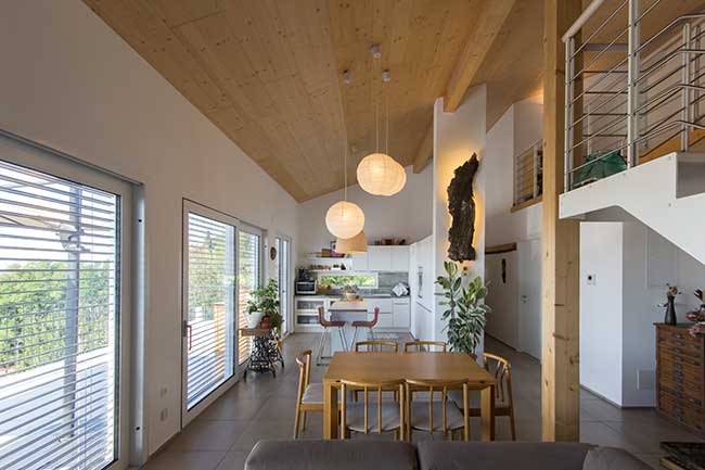 L’appartamento al primo piano, quello dove abitiamo io e mia moglie, è caratterizzato da un soppalco aperto sulla zona giorno. Il soffitto a una falda è tutto ricoperto in legno e il profumo è quel particolare in più che rende impagabile la scelta di una casa Vario Haus. Siamo felici di aver scelto una casa in legno Vario Haus e siamo onorati di poter raccontare la nostra personale esperienza che mostra la serietà e la professionalità di questa azienda e allo stesso tempo gli innegabili vantaggi di un edificio prefabbricato in legno.”
