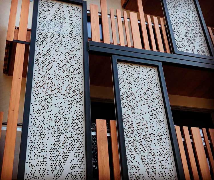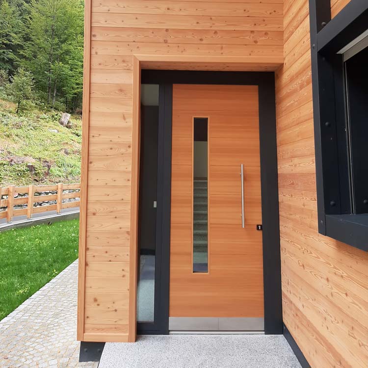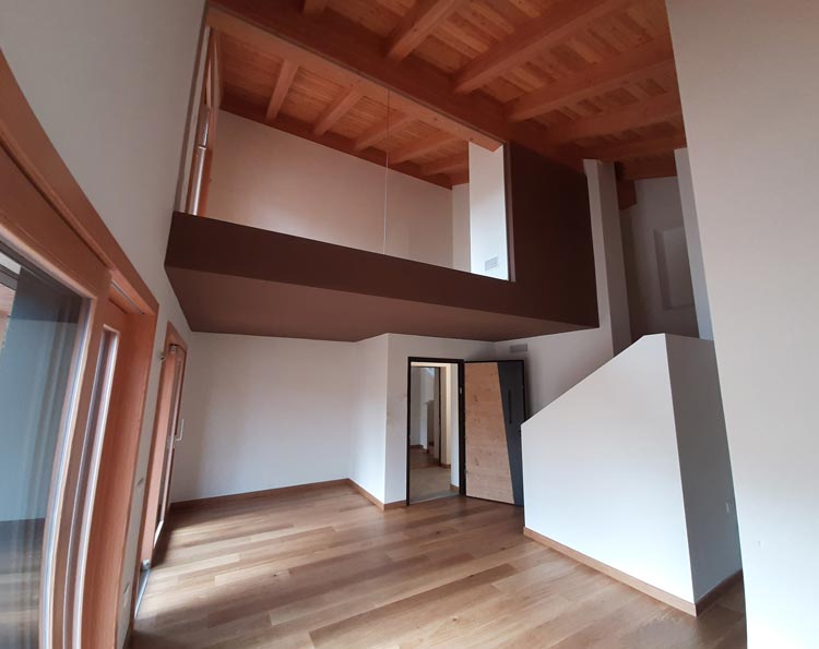 Per i rivestimenti esterni, i progettisti hanno sapientemente alternato tre tipologie di materiali – il legno di larice, intonaco e alluminio – che esaltano l’estetica variegata dei volumi e arricchiscono le superfici. Nel prospetto delle facciate si alternano, in un mix originale, elementi tradizionali come i parapetti in doghe di legno e elementi decorativi dal gusto moderno come i pannelli in lamiera forata che fungono anche da brise soleil, modulando l’ingresso della luce negli spazi interni. Analogamente i rivestimenti metallici in lamiera che scandiscono il volume d’ingresso alle autorimesse e quello del blocco scala del fronte est rappresentano un chiaro riferimento a un linguaggio architettonico nuovo, fortemente comunicativo ed incisivo.