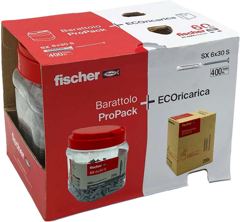 fischer – per spingere l’iniziativa in fase di lancio – propone anche REFILLPACK: una speciale confezione che contiene 1 barattolo ProPack + 1 ECOricarica. La confezione speciale è disponibile con tasselli in nylon SX e viti a testa svasata piana, sempre in 3 varianti