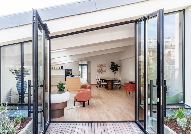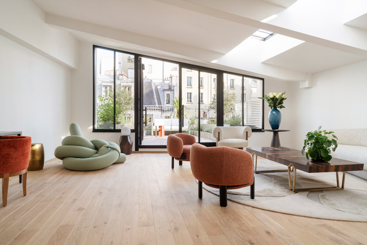 Le terrazze in legno, la vista sgombra sui tetti di Parigi, le piante verdi insieme ad un mobilio sobrio e minimalista definiscono l’esterno. L’ampio bovindo, il lucernario, i mobili di Philippe Hurel, dallo stile rappresentativo e senza tempo, insieme a materiali nobili quali legno, parquet, e gres porcellanato con finitura in marmo costituiscono invece i tratti distintivi degli interni. I colori pastello delle sedute ammorbidiscono il marmo ambrato del piano e l’ottone delle gambe del tavolino. Per un tocco insolito, si è optato per un pouf a forma di nodo, creazione dall’artista Marine Peyre. In questo appartamento l’apertura del soggiorno si apre sul disimpegno dove si trovano gli spazi privati ​​dei proprietari.