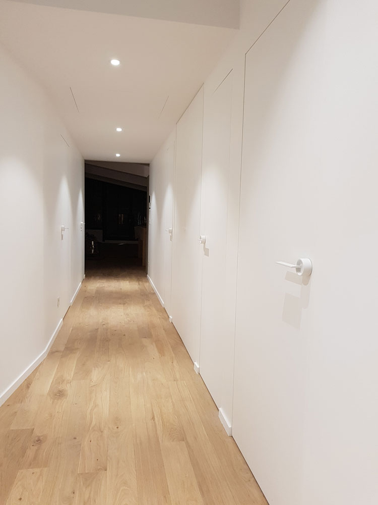 “Eravamo alla ricerca di porte capaci di diventare quasi invisibili, filo muro e moderne. L’obiettivo era quello di mantenere il più possibile il design e lo stile sobrio del luogo, anche in una stanza persa quale è il corridoio. Volevamo creare una sorta di atmosfera infinita. Le soluzioni ECLISSE sono state in grado di soddisfare questa necessità”, ha commentato Coralie Palaise. Nel complesso sono stati posati 6 modelli ECLISSE Syntesis Line Battente, i telai necessari all’installazione di porte filo muro. Questa tipologia di porte completa con discrezione il corridoio che conduce alle stanze personali, quali camere da letto, bagni e lavanderia, mantenendo la promessa di creare l’illusione di un muro privo di interruzioni.