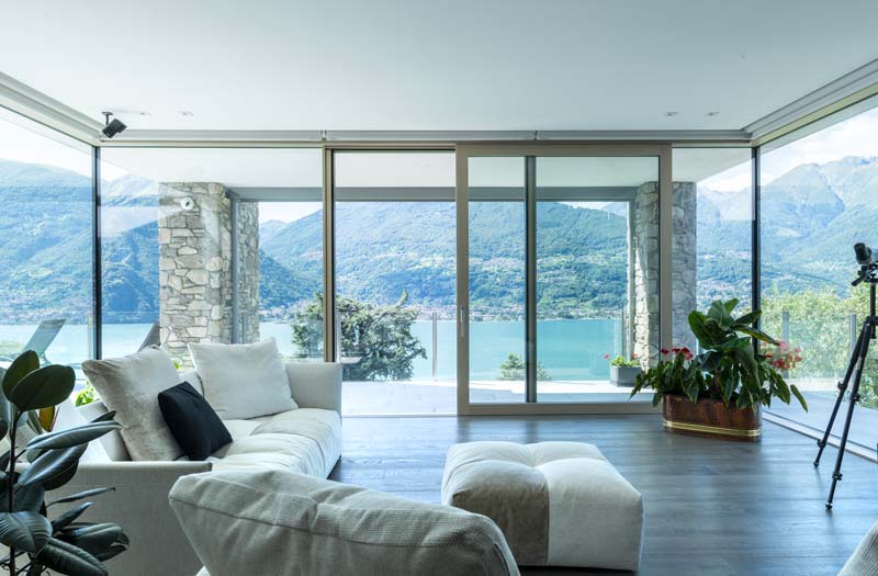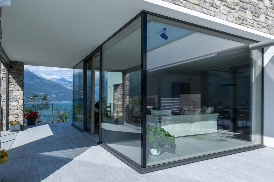 Una scelta di altissima qualità e di grande effetto, per la trasparenza dei vetri Eclaz®, per la resistenza al vento che spesso viene dall’altro lato del lago grazie al vetro incollato su tutto il perimetro, per l’eleganza del legno che ben si addice ad un’architettura così raffinata e agli arredi di gusto.