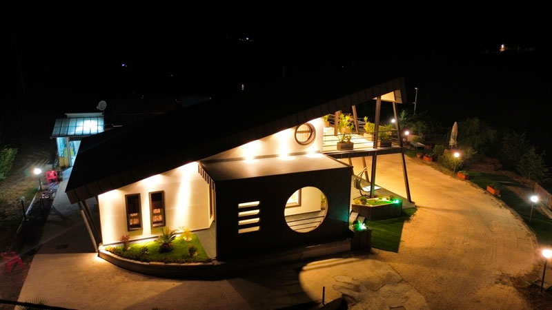 L’edificio si articola su due livelli, seguendo un concetto architettonico semplice e al tempo stesso ricercato. Lo sviluppo della villa è prevalentemente orizzontale, occupando con forma regolare lo spazio in pianta a livello del terreno, con un accento originale e discreto, costituito dall’elevazione del primo piano mansardato, dotato di una grande terrazza a loggiato. Il lato dell’ingresso, protetto da una struttura a loggiato, crea una piacevole variazione alle forme lineari, con due aperture rotonde, che danno carattere all’insieme rispettandone le armonie geometriche. Anche la grande copertura segue lo stesso linguaggio, con una superficie ampia e regolare ad una sola falda, che con la sua semplicità esprime eleganza e piena integrazione con il paesaggio, grazie anche alla scelta del colore marrone bruno del rivestimento in tegole di alluminio.