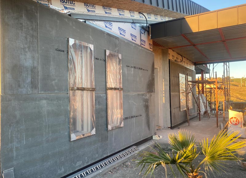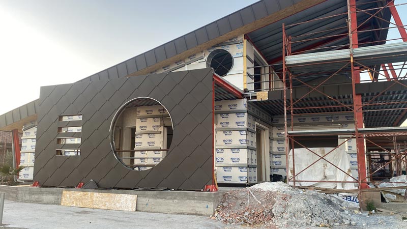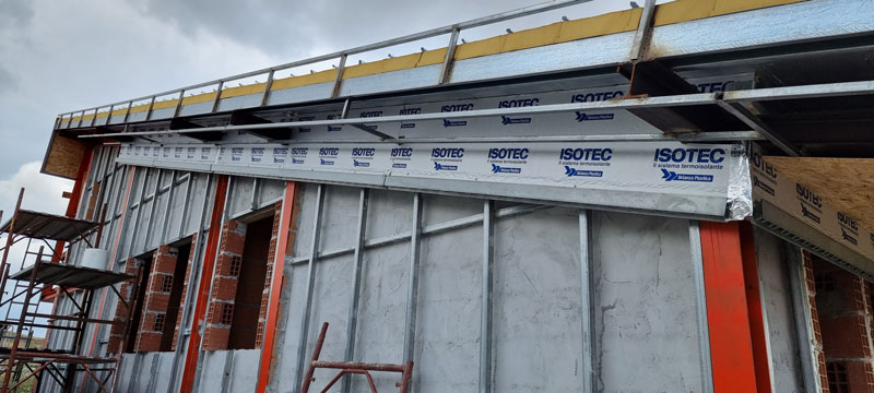 I pannelli Isotec Parete offrono un doppio grado di compatibilità: infatti si posano su qualsiasi tipologia di supporto portante, continuo o discontinuo. In questo caso, sulla muratura di tamponamento è stata fissata una sottostruttura metallica per uniformare le quote, portando il piano di posa a filo con lo spessore della struttura portante in acciaio. Infine, ai pannelli Isotec Parete sono state fissate, con le apposite viti, le lastre in fibrocemento Elycem, robuste e leggere, ideali per realizzare una tradizionale rasatura ad intonaco delle facciate, creando un elegante contrasto con il marrone scuro dell’alluminio che riveste il dettaglio dell’ingresso e la copertura.