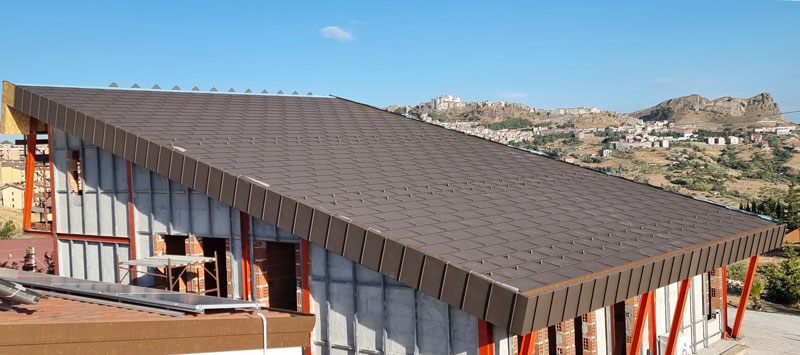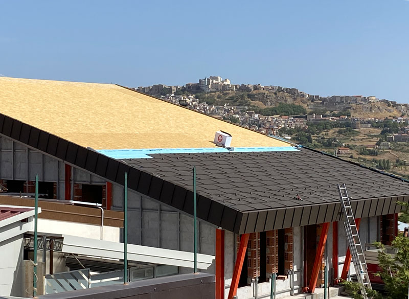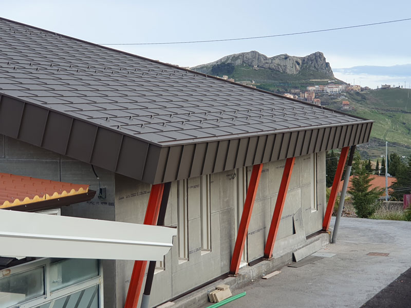 La stratigrafia del tetto ha previsto la posa – sulla struttura portante discontinua in acciaio – dei pannelli Isotec, spessore 120 mm, funzionali a realizzare un isolamento ventilato performante e continuo. Sui correntini metallici di Isotec sono stati poi posizionati e fissati i pannelli in OSB, necessari alla posa del rivestimento metallico. Tutte le opere di lattoneria di rivestimento di tetto e facciata, così come i raccordi, la terminazione laterale della copertura e la fasciatura del bordo della terrazza, sono stati realizzati con prodotti in alluminio di alta qualità e coordinati nella stessa colorazione.