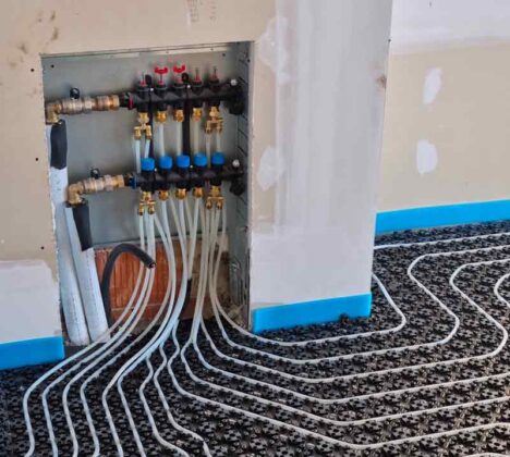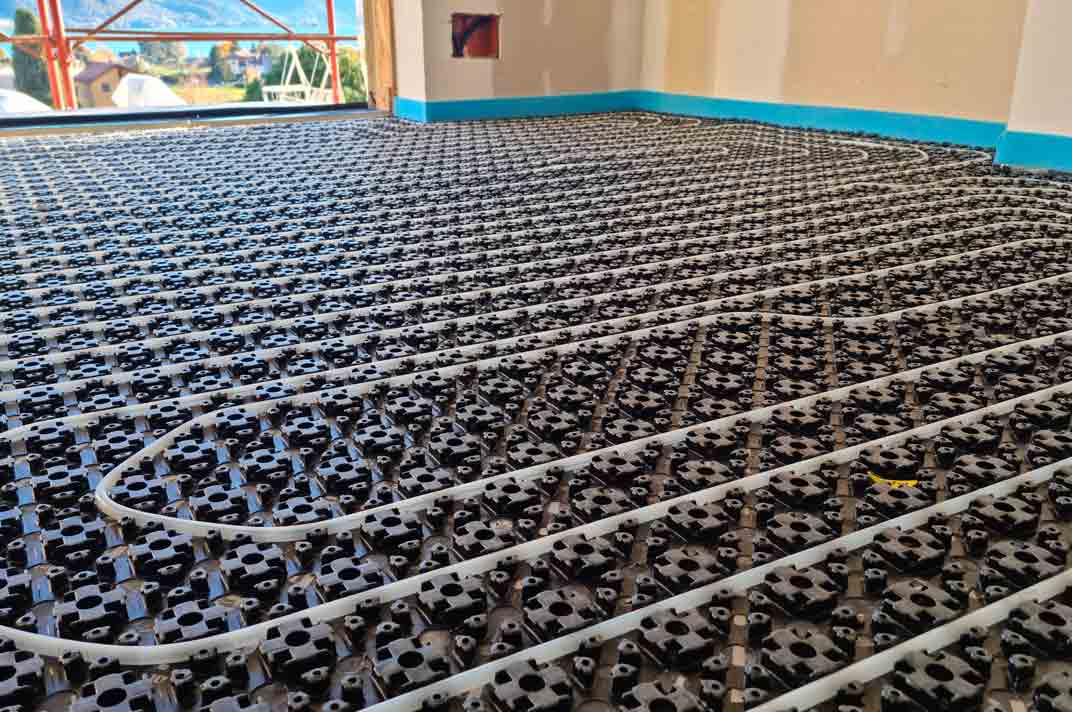Nella ristrutturazione di una palazzina di 8 unità ridestinata a uso ricettivo a Gravedona (CO) è stato realizzato un impianto di riscaldamento a pavimento con una soluzione a pacchetto certificata composta dal materassino acustico IsolTile Classic di Isolmant (0,2 cm), impianto radiante Minitec di Uponor (1,2 cm) e autolivellina Knauf NE 425 (1 cm).