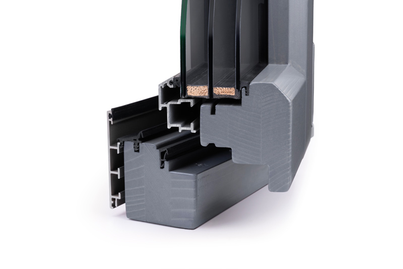 Tra le proposte più avanzate dell’azienda spicca il modello Oceano 2.0, finestra in legno-alluminio con anta da 68 mm di spessore, adatta a vetri tripli riempiti con gas argon e doppia vetrocamera warm edge. Questo sistema raggiunge uno dei valori di trasmittanza termica più bassi in commercio (Uw = 0,99 W/m²K con vetro Ug = 0,6). Il rivestimento esterno in alluminio, applicato tramite clip distanziatrici, evita il ristagno di umidità e quindi la formazione di muffa e condensa. La tripla guarnizione sul telaio assicura una chiusura ermetica, mentre cerniere a scomparsa e soglia a taglio termico completano la dotazione nella versione portafinestra.